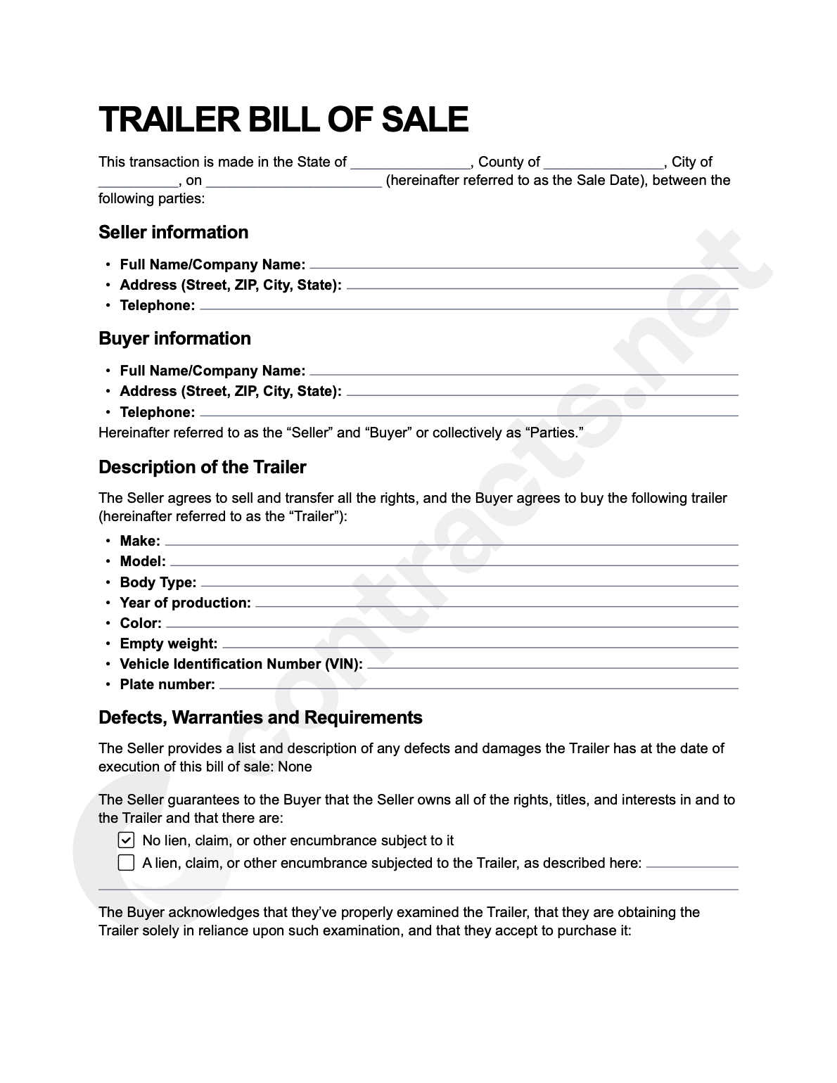 Trailer Bill of Sale Form Template in PDF Free Printable Blank