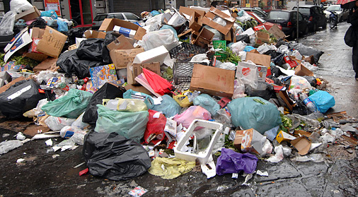 Overflowing overfilled filled full trash cans bins cardboard recycling