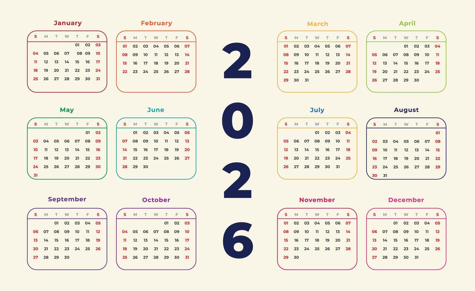 Calendar template for 2026 year 68637115 Vector Art at Vecteezy