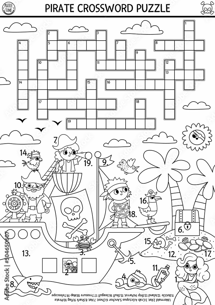 Black and white vector pirate crossword puzzle for kids Simple line