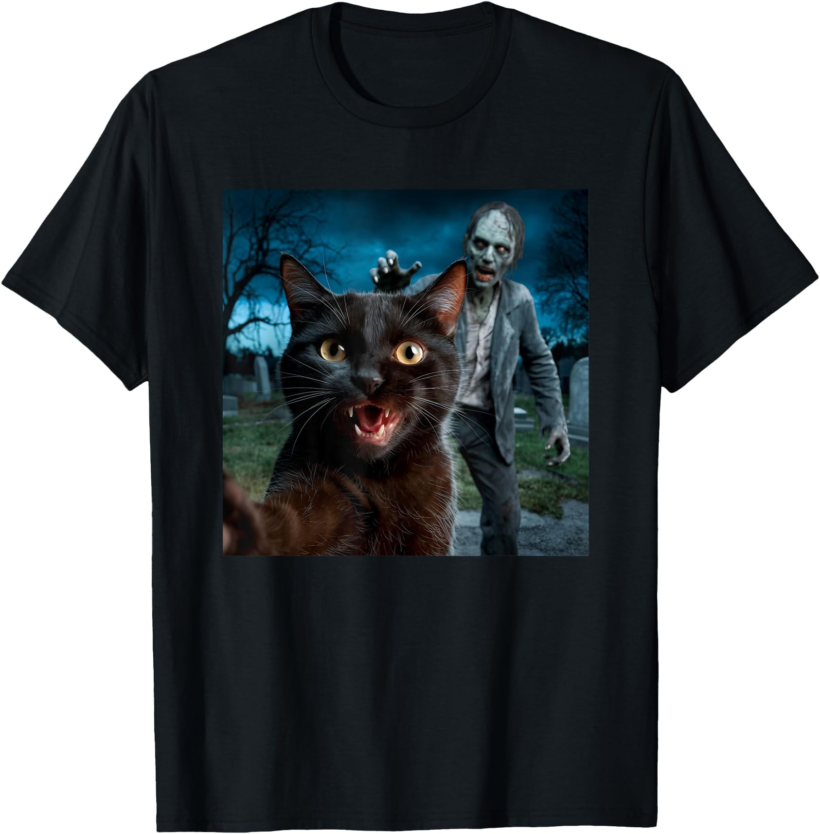 Hot Trending Tee With Cat And Zombie Selfie Photo For Cat Lovers Unisex