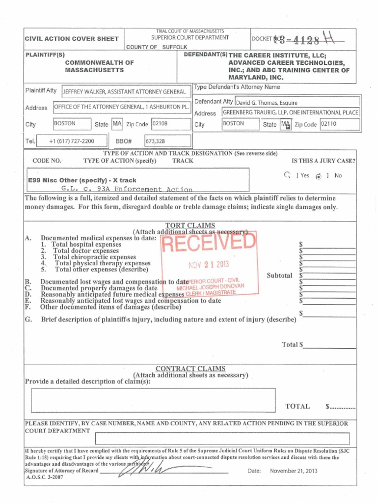 Mass Superior Court Civil Action Cover Sheet Fill Online Printable