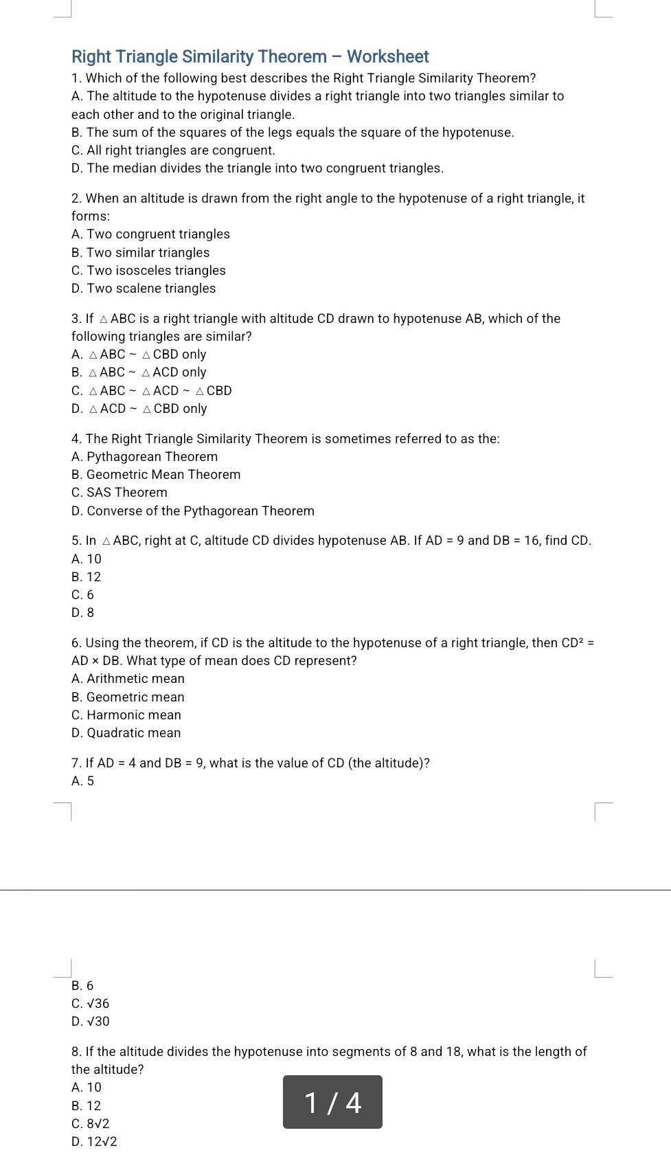 Solved: Right Triangle Similarity Theorem Worksheet 1 Which of the