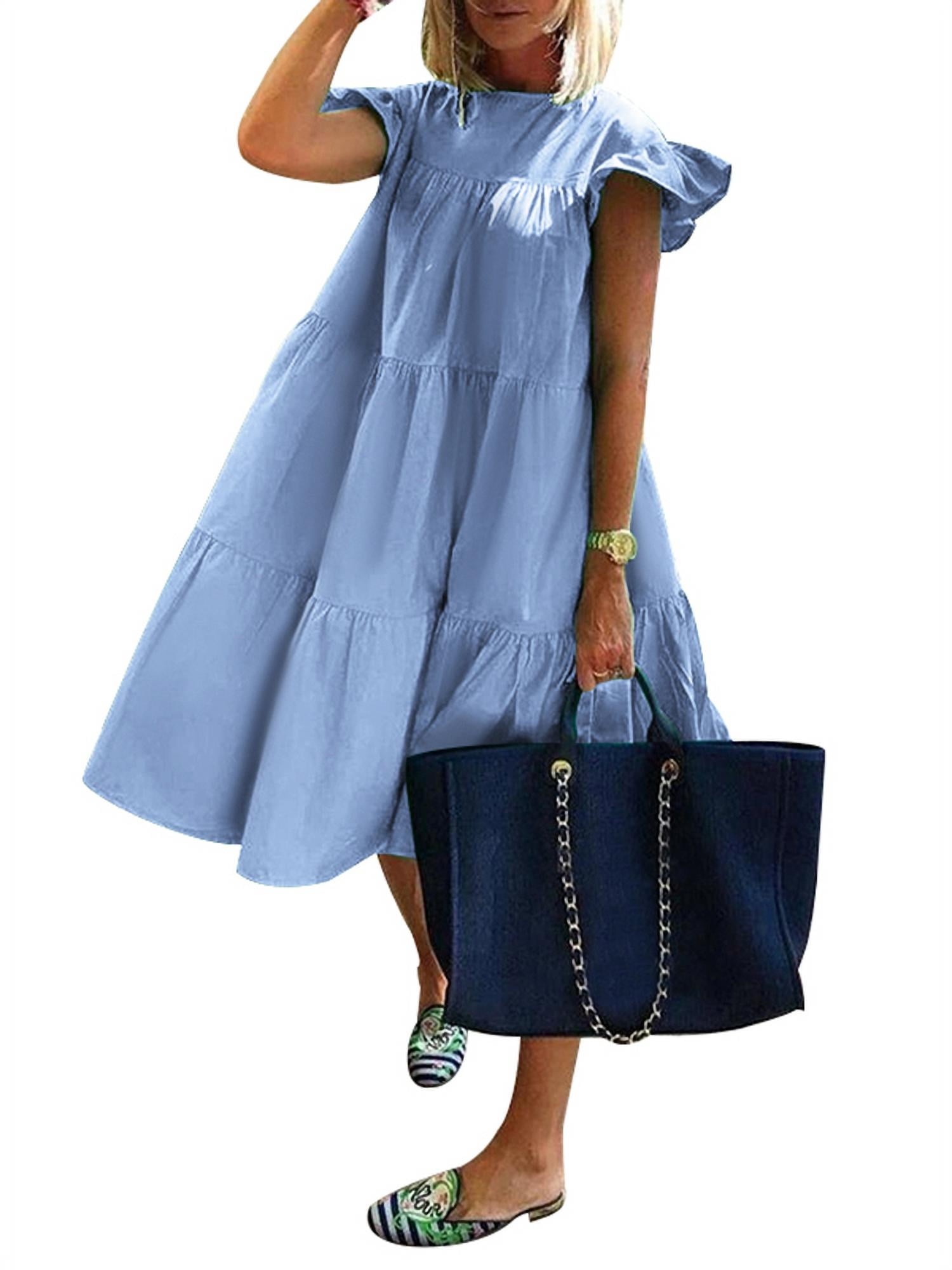 VONDA Women #39 s Crew Neck Casual Short Sleeve Ruffle Trim Summer Mini