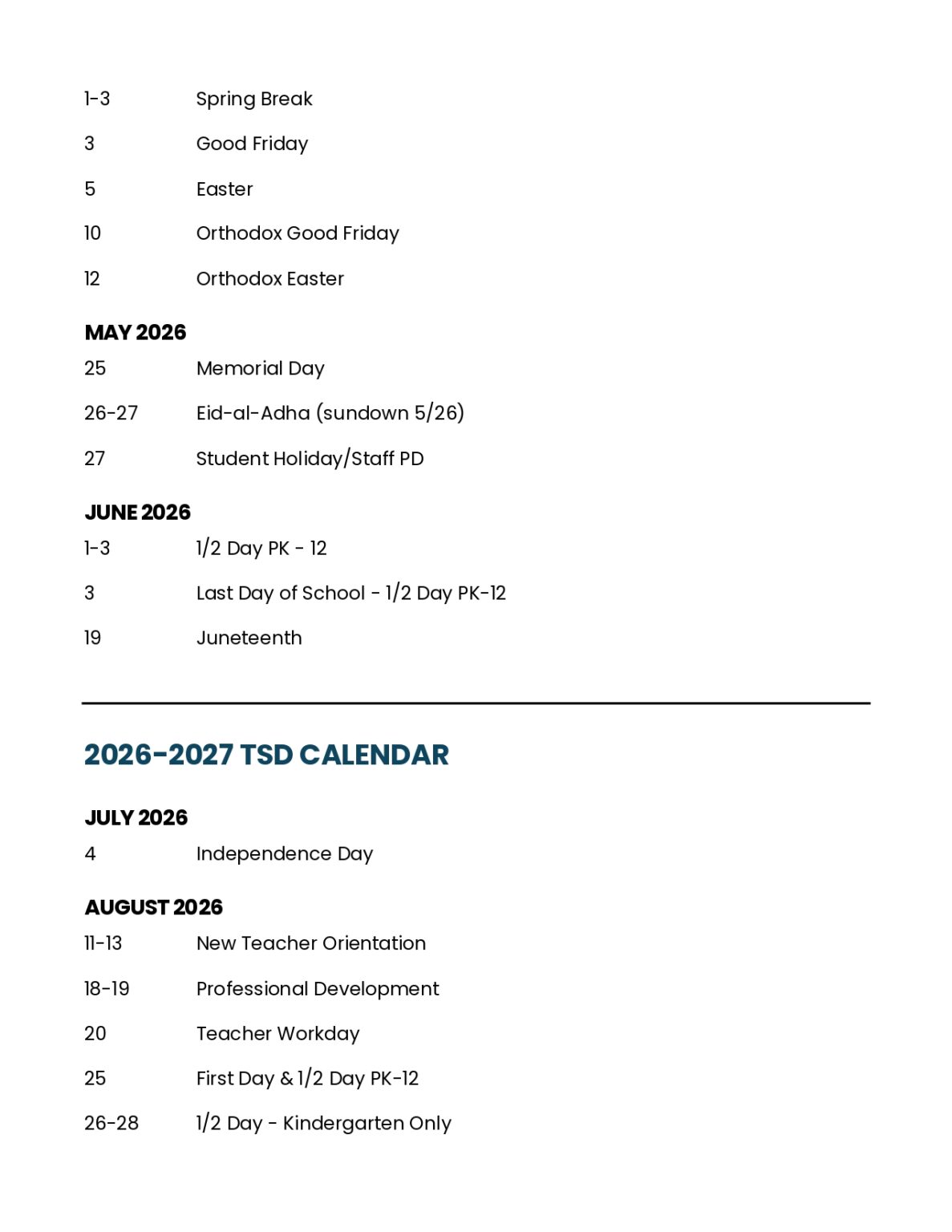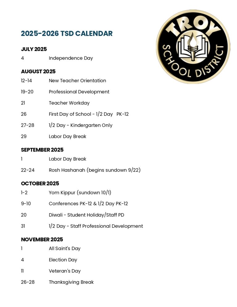 Troy School District Calendar 2025 2026 in PDF
