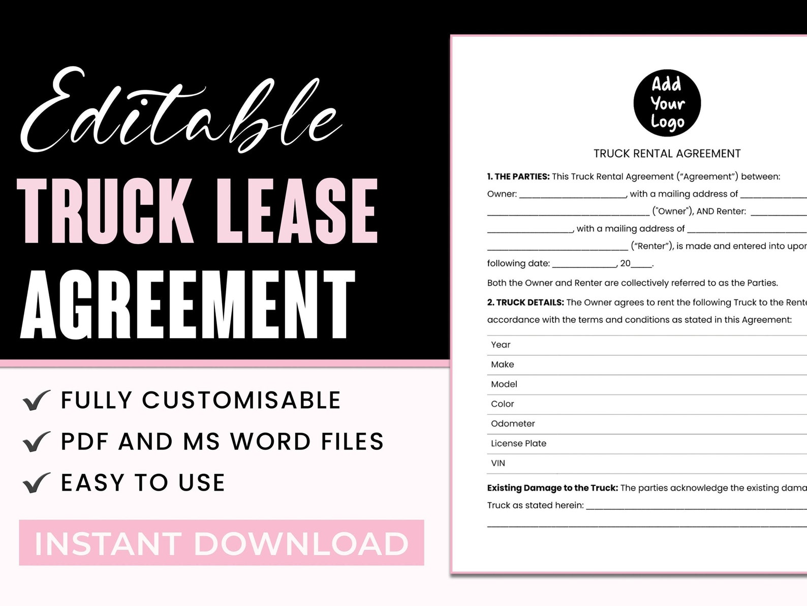 EDITABLE Truck Lease Agreement food Truck Contract commercial Truck