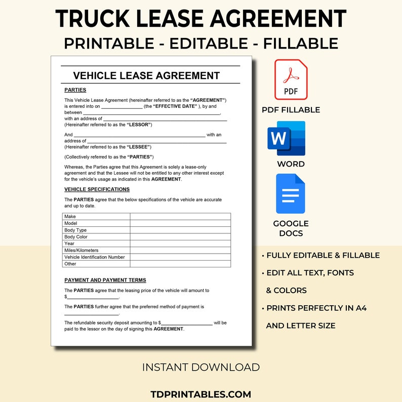 Truck Lease Agreement Template PDF Fillable Printable Editable Ms