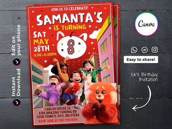 Turning Red Invitation Birthday Party Meilin Editable Kids Red Etsy