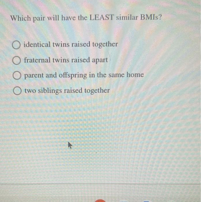 Solved Which pair will have the LEAST similar BMIs? Chegg com