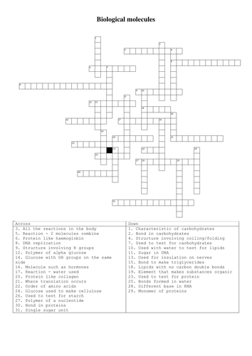 Revision crossword on Biological Molecules F212 Teaching Resources