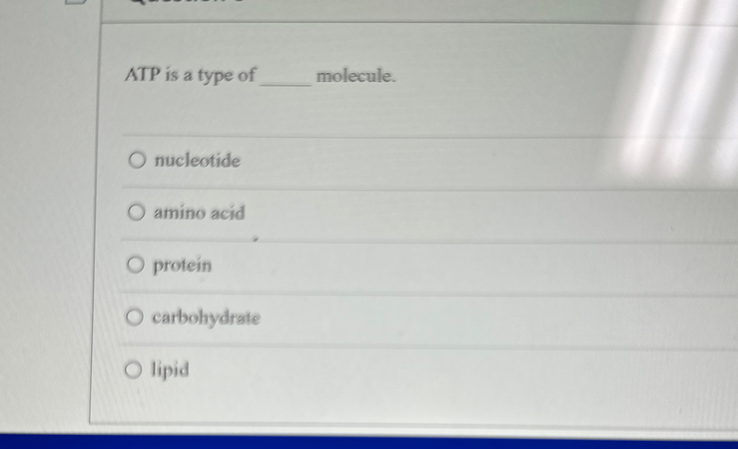 Solved ATP is a type of molecule nucleotideamino Chegg com
