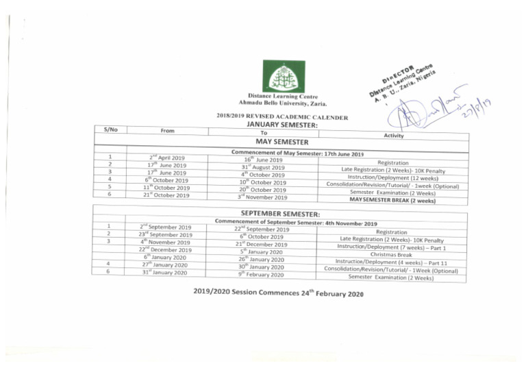 UAT Academic Calendar for 2018/2019 Academic Session