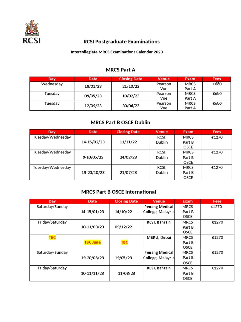 RCSI Professional Examinations Surgery Examinations Calendar 2023 PDF