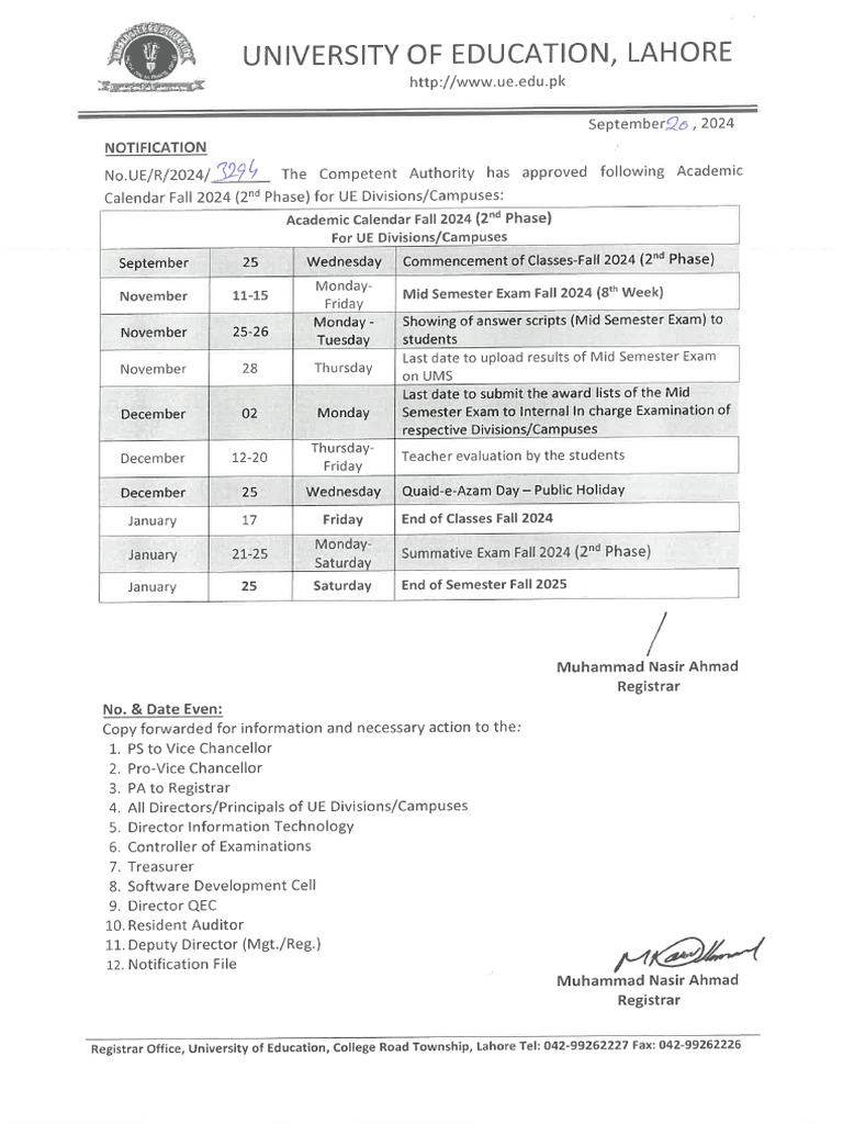 Notification Academic Calendar Fall 2024 (2nd Phase) For UE Divisions