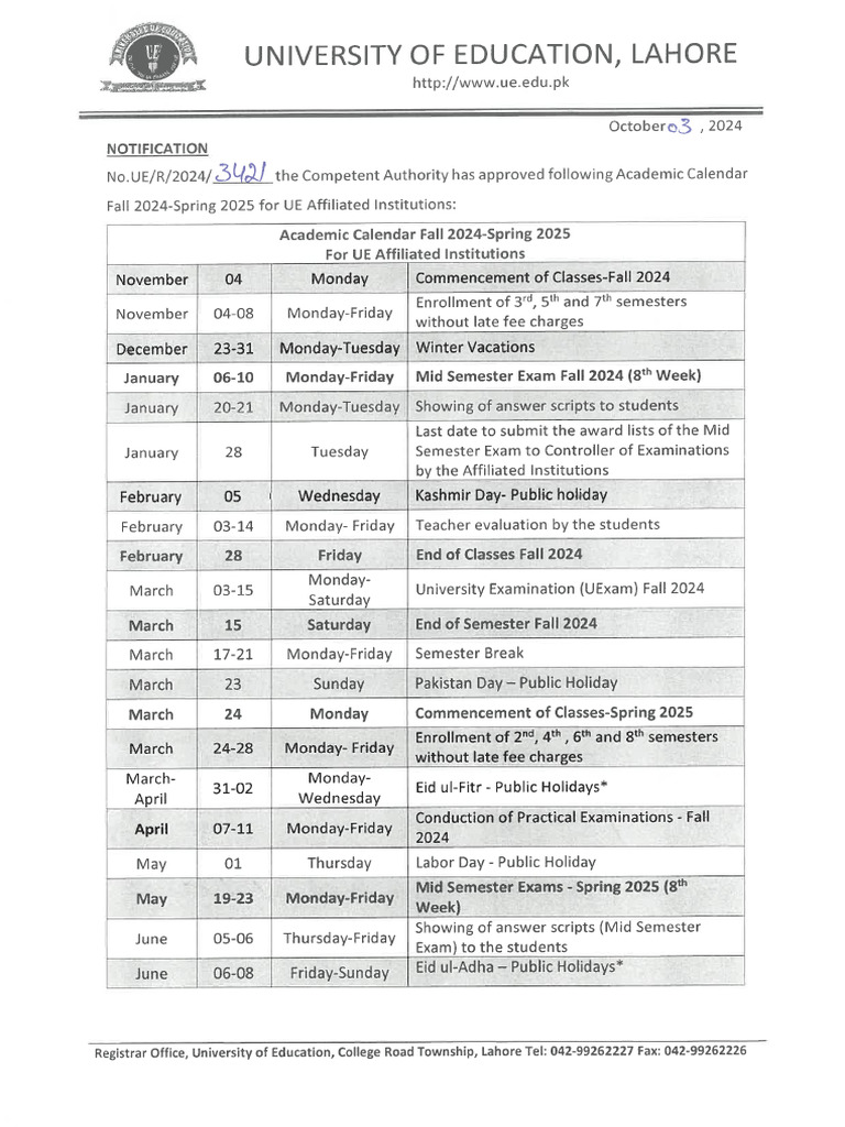 Notification Academic Calendar Fall 2024 Spring 2025 For UE Affiliated