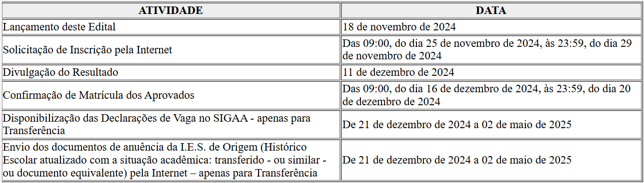 Inscrições para seleção de transferência de outras I E S e admissão de