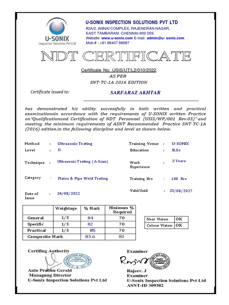 Karthikeyan P: b) Ultrasonic Testing (UT) Level 2
