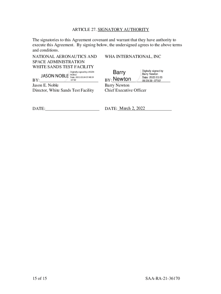 Fillable Online nonreimbursable space act umbrella agreement NASA Fax