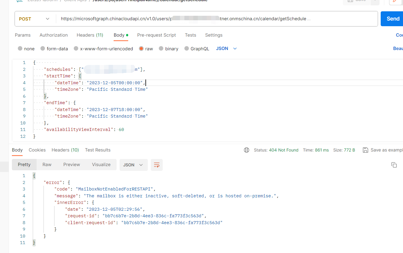 Unable to obtain free/busy time of calendar using Microsoft Graph API
