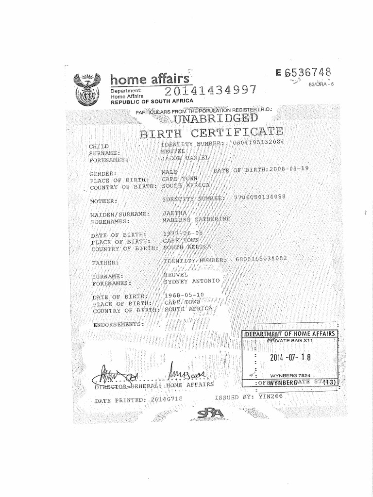 Example of Unabridged Birth Certificate Vryheid Landbou High School