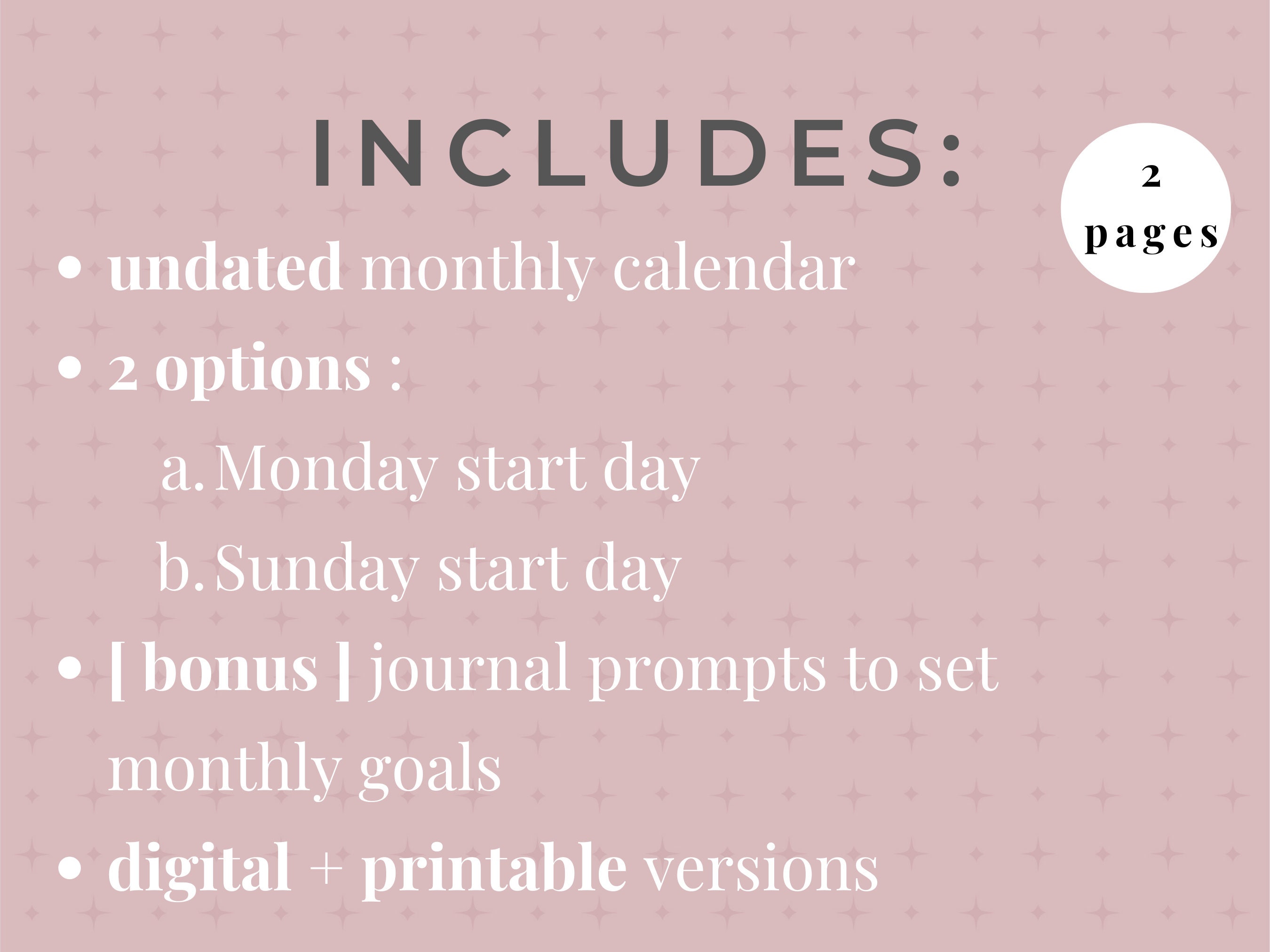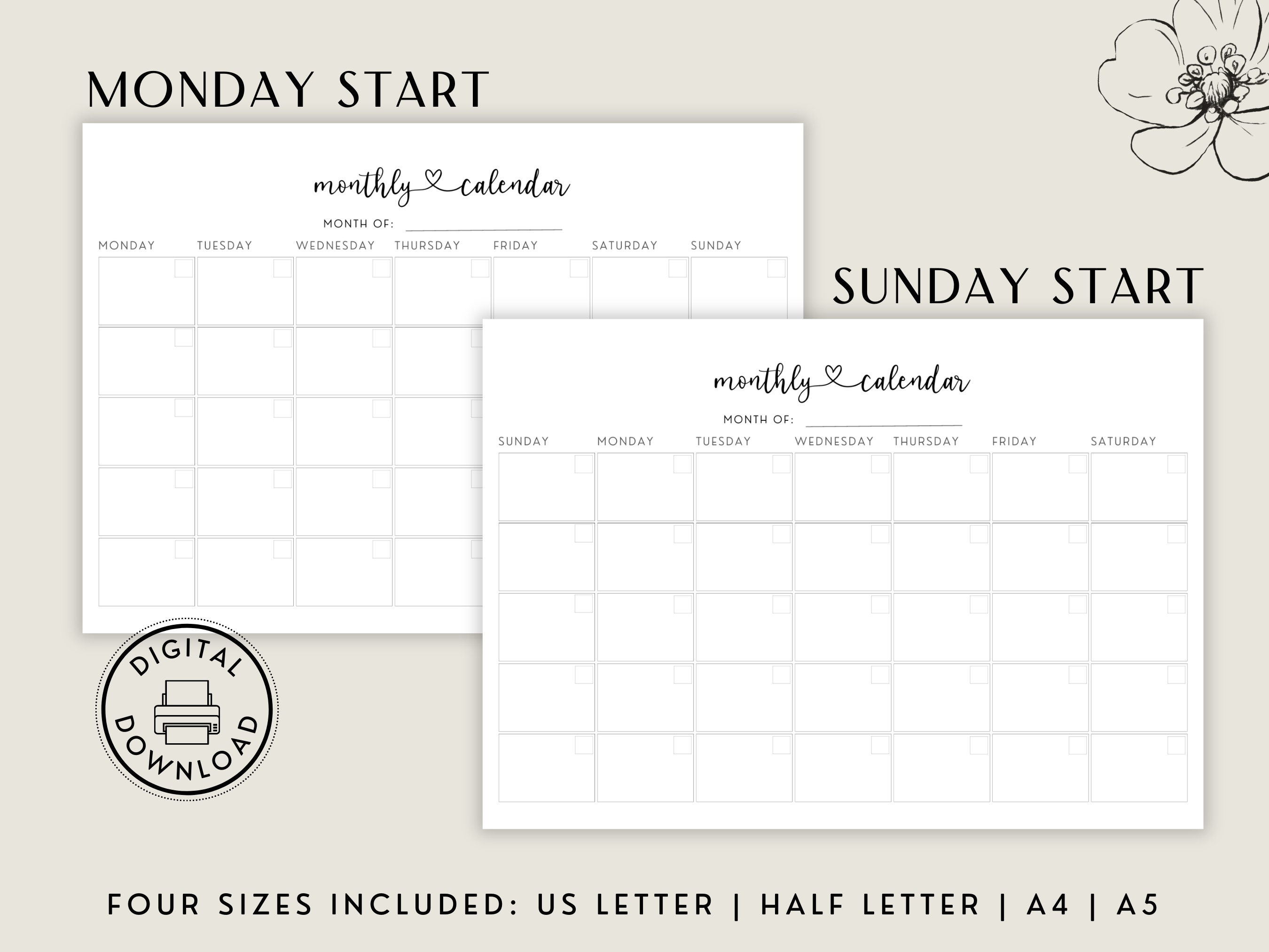 Undated Monthly Calendar Printable Digital Planner Monthly Preview