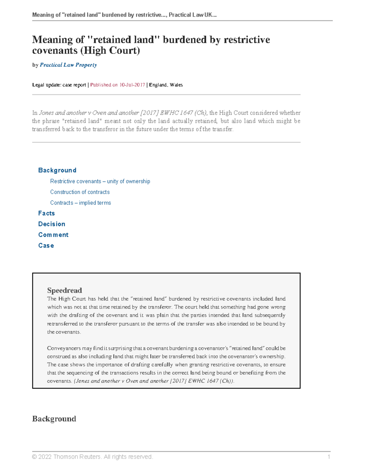 Meaning of retained land burdened by restrictive covenants (High Court