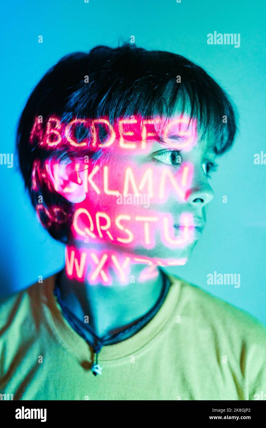 Portrait of unemotional boy with big sad eyes in room with neon light