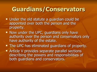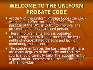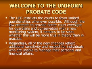 The article deals with the Uniform Probate Code (UPC)