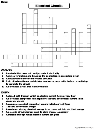 Electrical Circuits Crossword Puzzle Teaching Resources