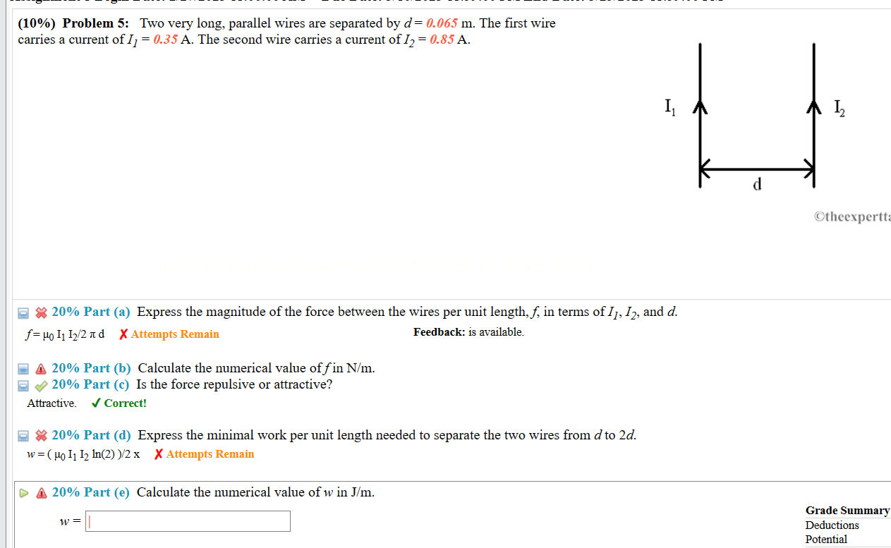 Solved (10 #92 %) Problem 5: Two very long parallel wires are Chegg com