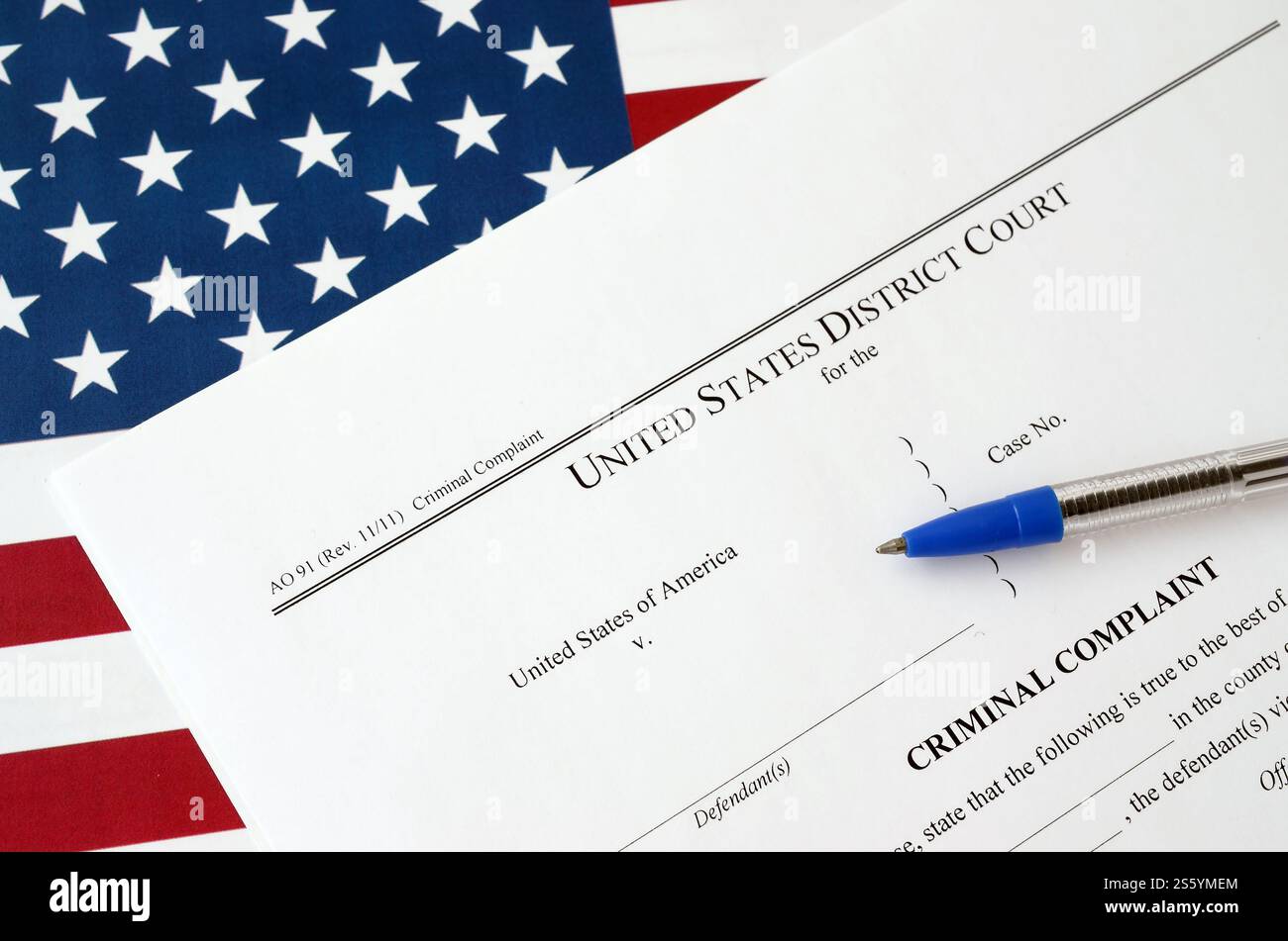 District Court Criminal complaint court papers and blue pen on United