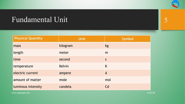 Fundamental units table on a green background Education Science