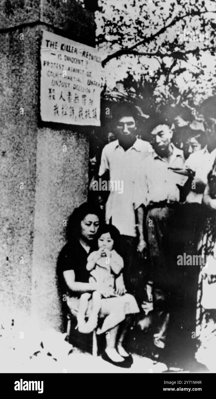 The widow of Liu Chi Jan and her child sit under the sign outside the