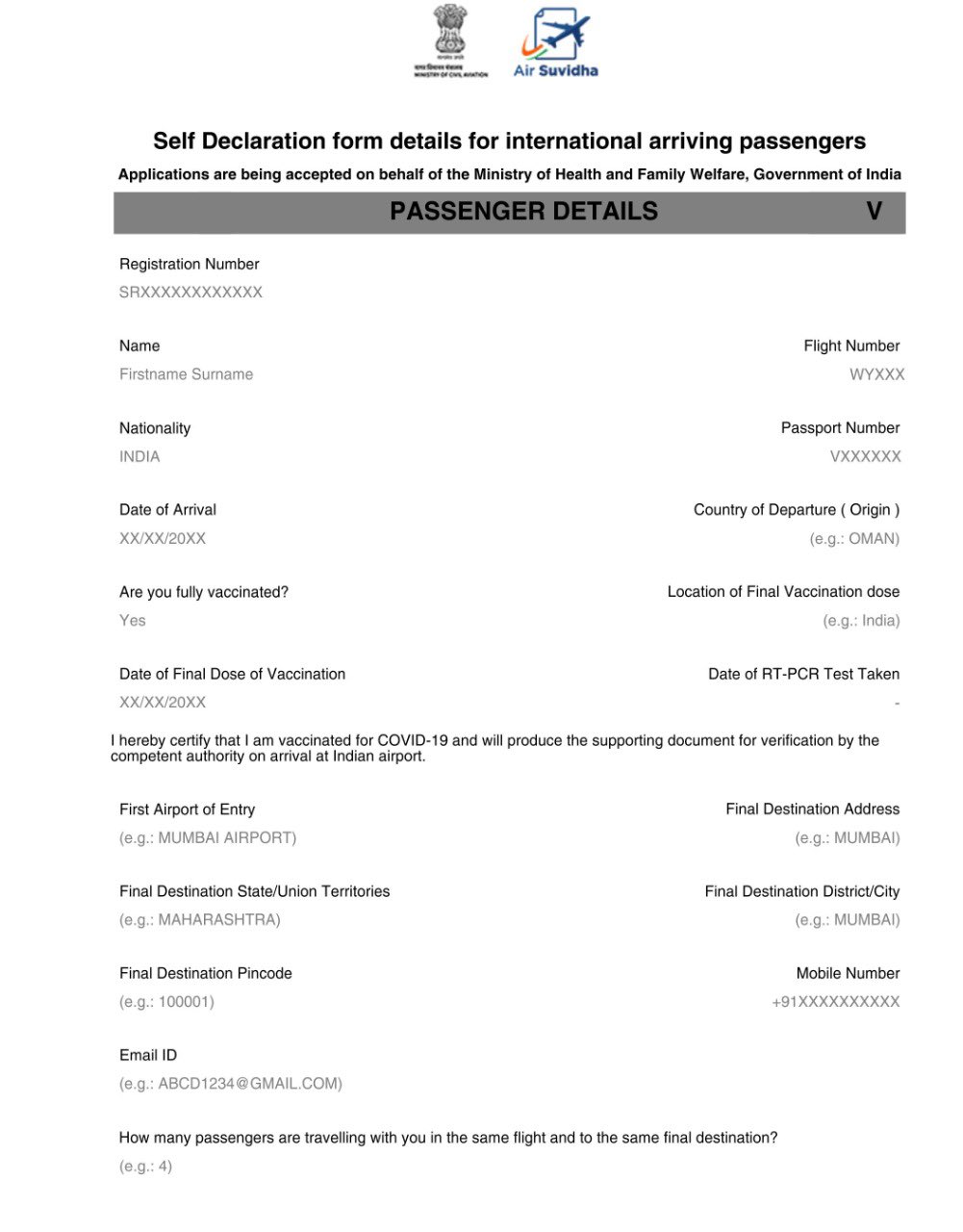 Air Suvidha Self Declaration from for all travelers who wish to enter India