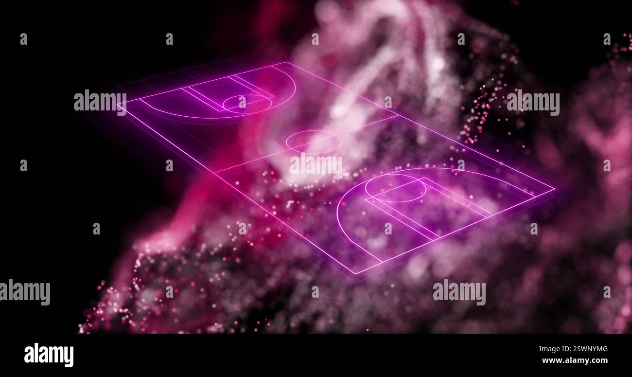 Basketball court layout image over abstract pink and black background