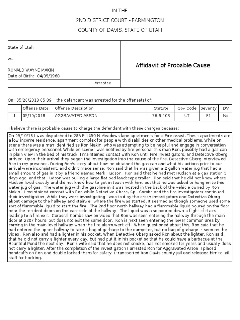 Affidavit of Probable Cause: in The 2Nd District Court Farmington