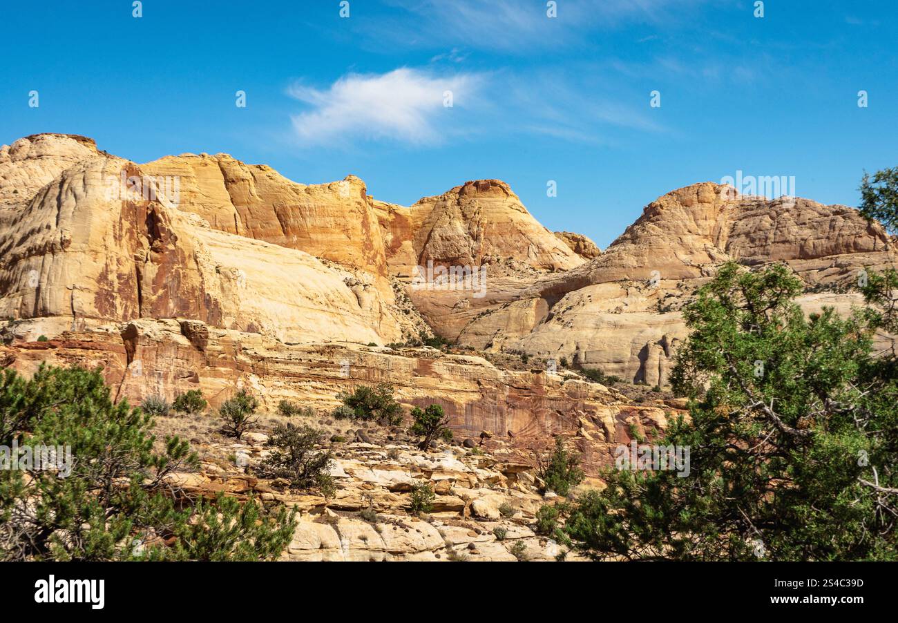 Stunning sandstone formations basking under a clear blue sky at Capitol