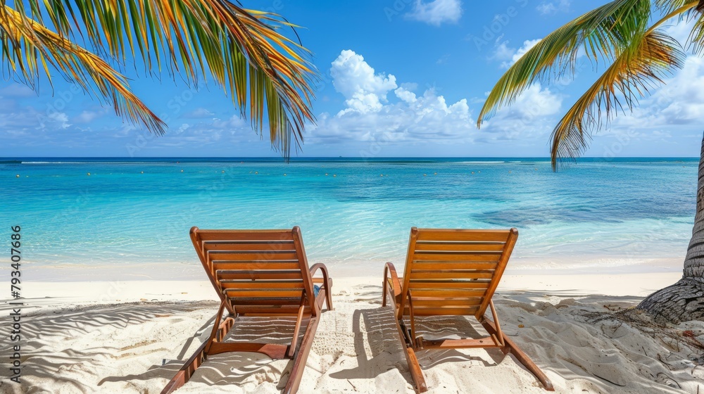 Inviting tropical beach scene with two wooden lounge chairs facing calm