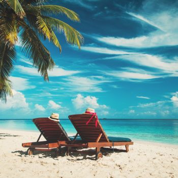 Couples vacation chairs and umbrella under palm tree leaves romantic