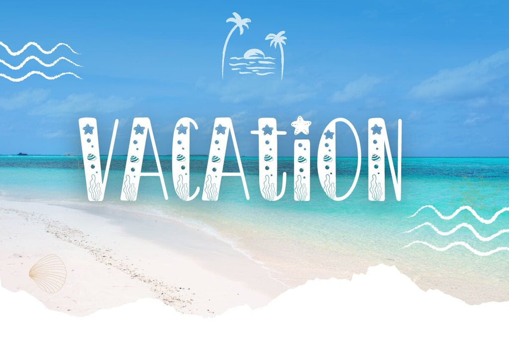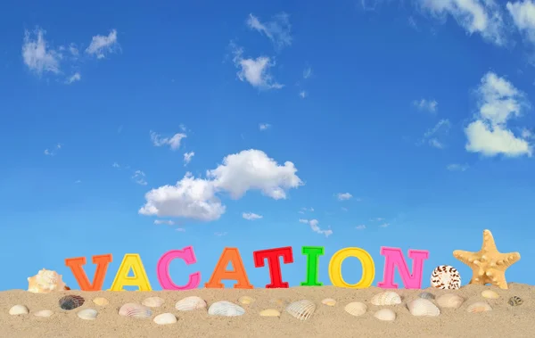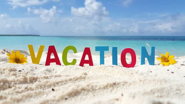 Vibrant VACATION Sign Standing Boldly on a Sunny Tropical Beach Stock