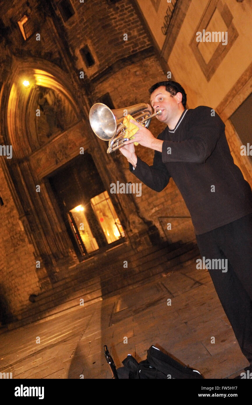 busker in Barcelona playing fiscorn a Catalonian conical bell forward