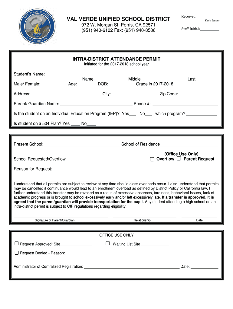 Fillable Online valverde INTRA DISTRICT ATTENDANCE PERMIT valverde