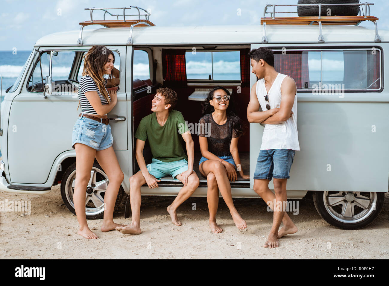 happy hipster enjoy holiday while leaning at their vintage van Stock