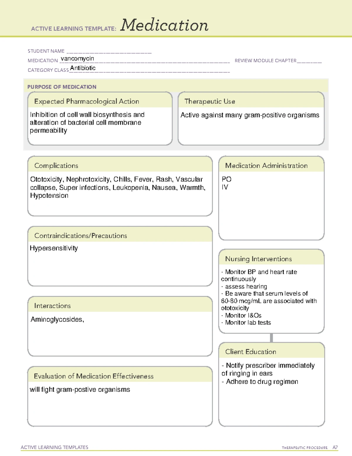 ATI medication template Vancomycin filled in ACTIVE LEARNING