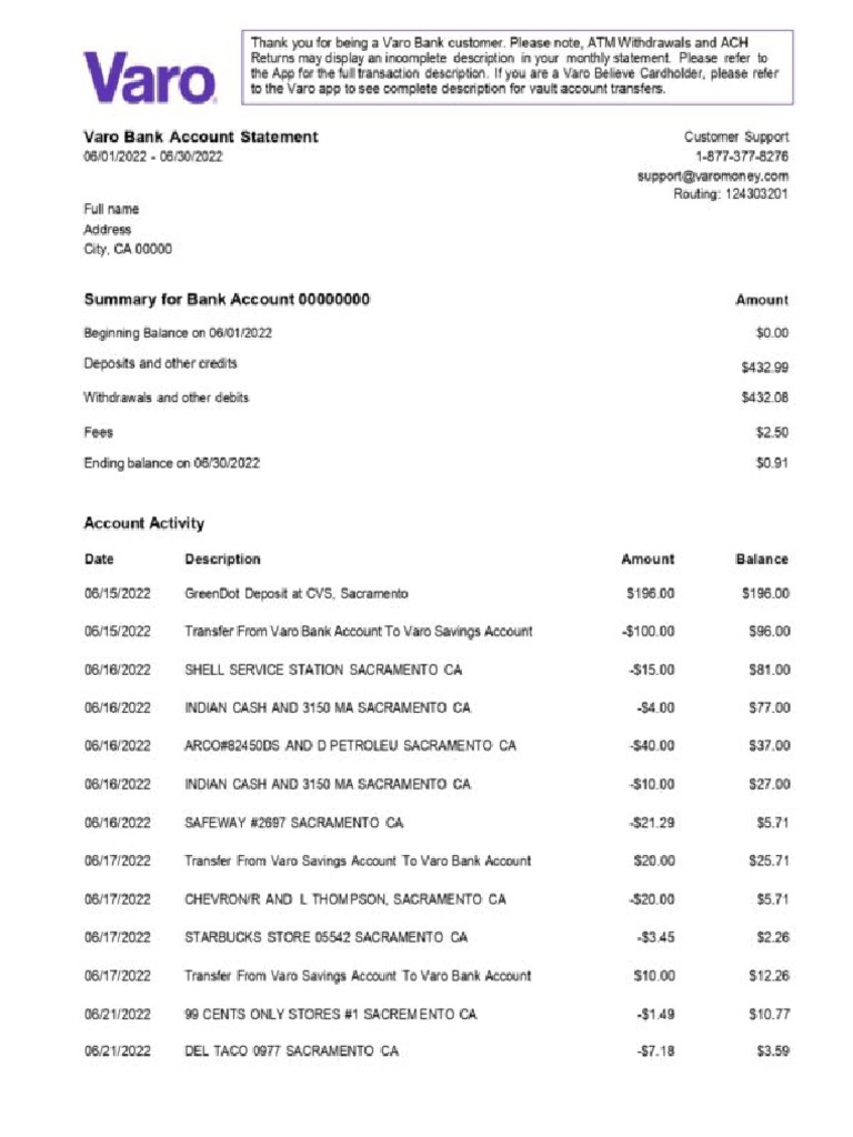 Varo Bank Statement Template Fill Online Printable Fillable Blank