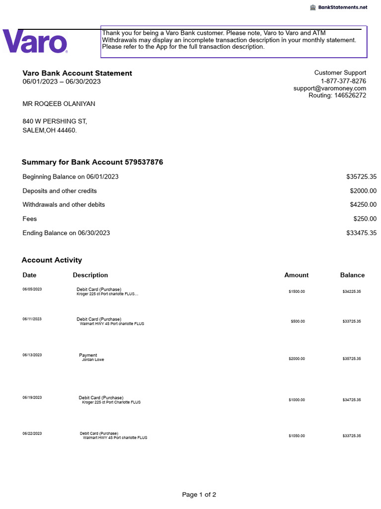 USA Varo bank statement Word and PDF template 2 pages version 2 roposh