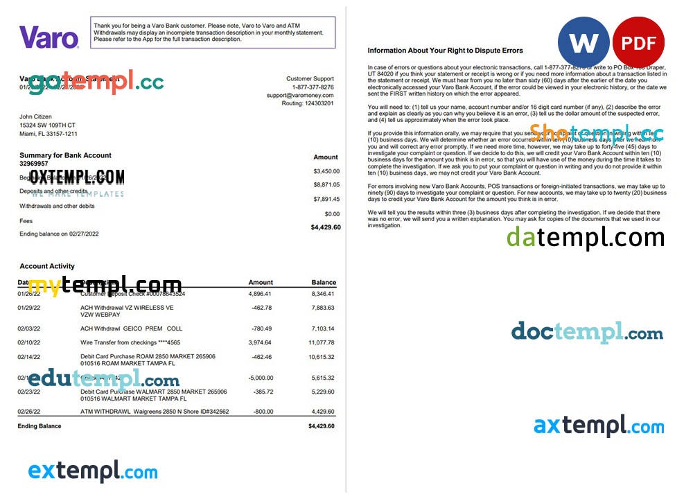 sample USA Varo bank statement Word and PDF template 2 pages version