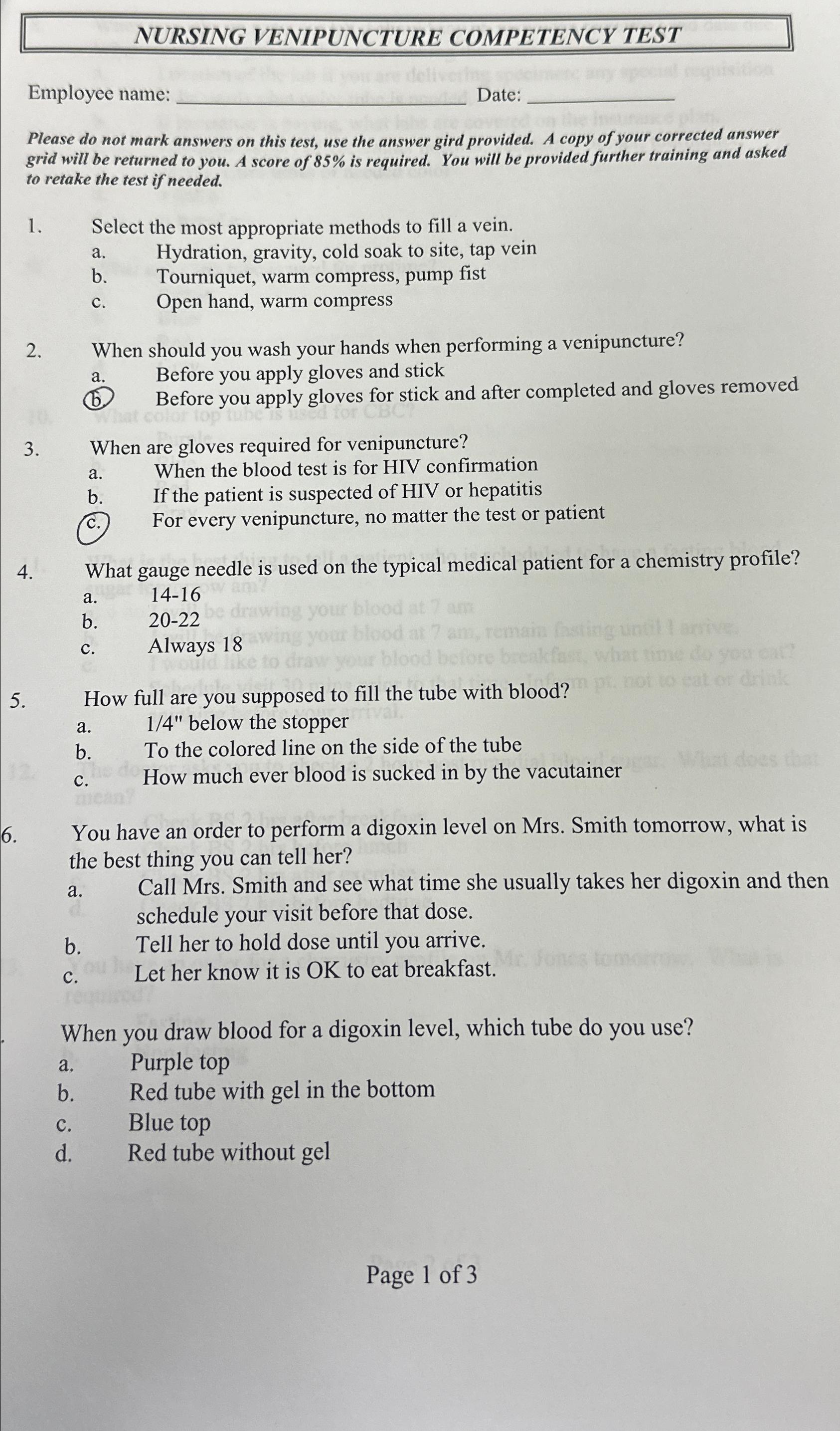 Solved NURSING VENIPUNCTURE COMPETENCY TESTEmployee Chegg com