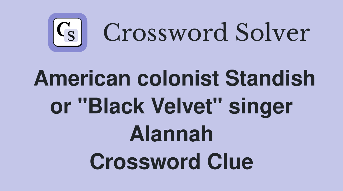 American colonist Standish or quot Black Velvet quot singer Alannah Crossword