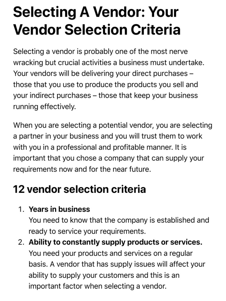 Selecting A Vendor Your Vendor Selection Criteria PDF Market
